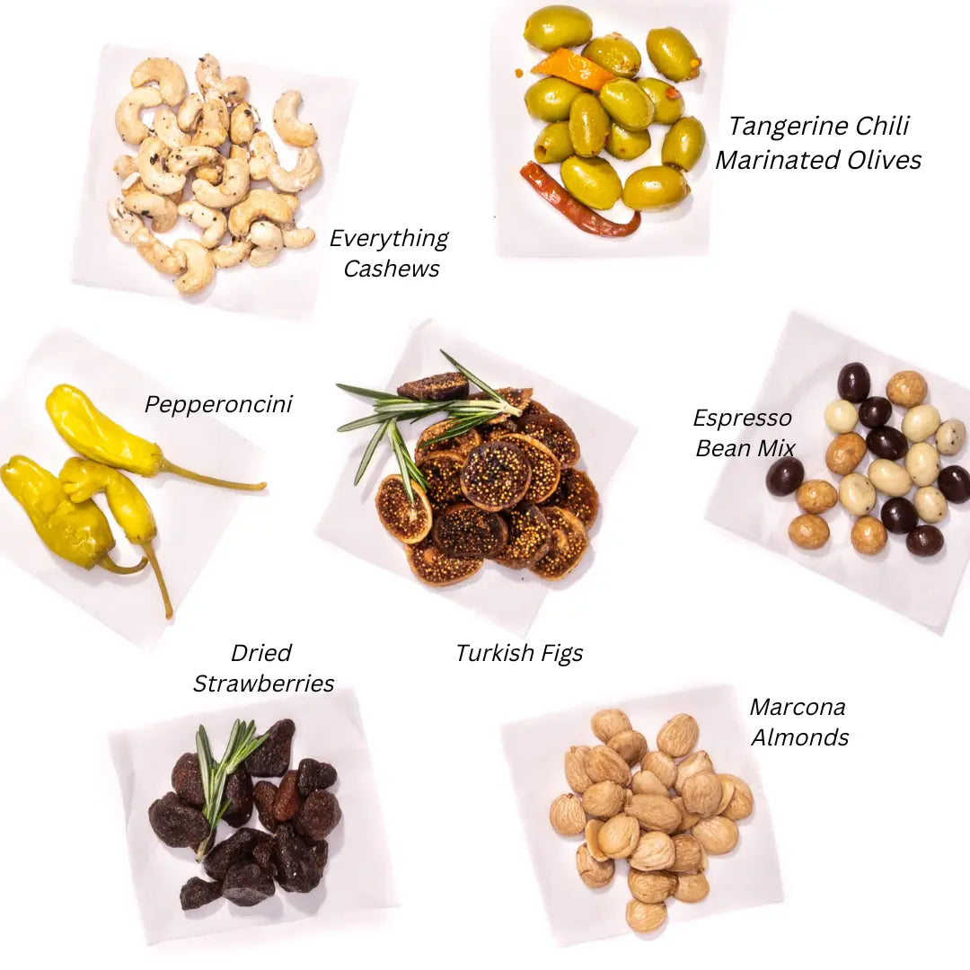 • 18 hand-selected artisan cheeses, meats, dried fruits, nuts, chocolates and olives