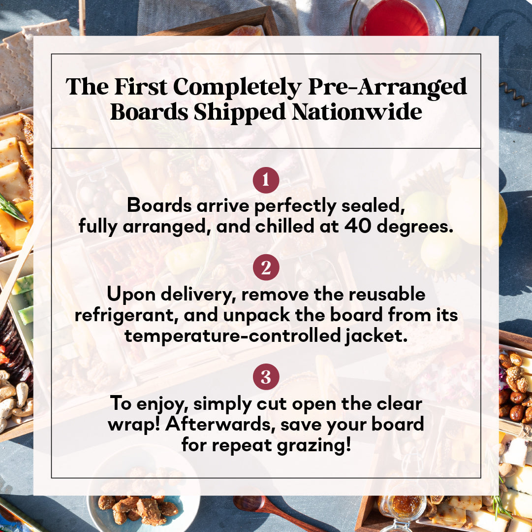 Each board is perfectly sealed to ensure freshness and quality. To enjoy, simply cut open the clear wrap and it is ready-to-share. Once you're done, save your board for repeat grazing!