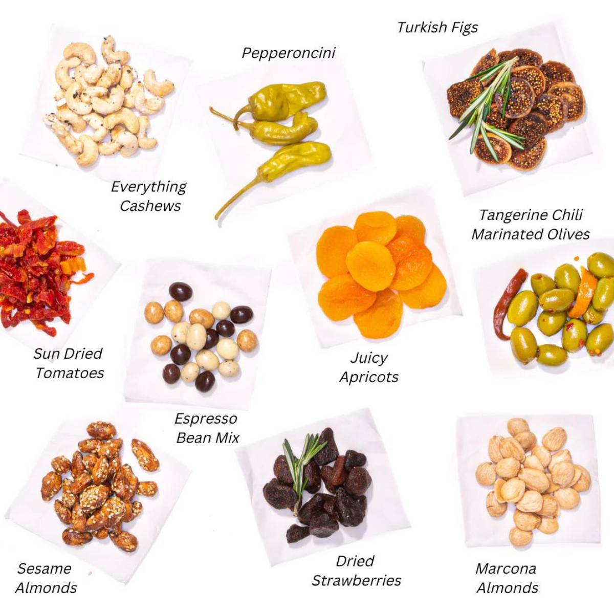 • 21 hand-selected artisan cheeses, meats, dried fruits, nuts, olives and chocolates